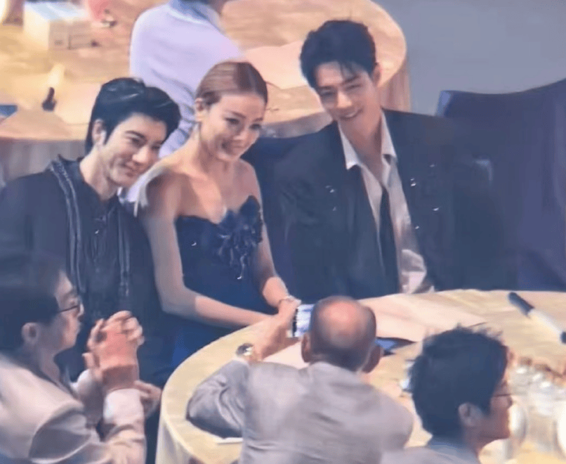 台下众星也氛围非常不错,不看节目的时候都在社交,肖战和容祖儿、王力宏、成龙等人坐在一起,进场就打招呼合照,关系非常不错,帮忙拍照的还是英皇老板杨受成。