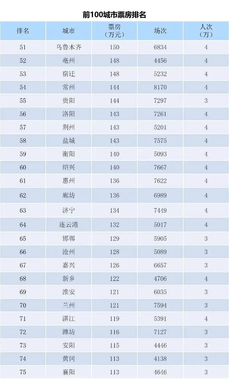 排名影院票房(万元)场次人次(人)26益阳万达广场店19.53391413627江苏徐州苏宁彭城大地影城19.31297441428内蒙古鄂尔多斯市万达影城万达广场店19.28350403529江西省上饶市信州区万达影城19.02346405030乌鲁木齐万达广场店18.94443368431甘肃省庆阳市西峰区M电影城堡18.64298442232山西省大同市万达影城广场店18.61331409633湖北荆州市万达影城武德路店18.45316433234河南省商丘市万达影城18.38354413035河南省濮阳市万达影城18.38324462336江苏邳州华夏新华大地影城18.19220507037武汉武商摩尔国际电影城18.15564507238吉林省长春市经开区寰映影城17.96326396739江苏蓝海--南通蓝海影城17.91221451740江苏连云港赣榆区青口镇中数影城17.89297453741湖南省郴州市时尚中影数字国际影城17.86446511442河南安阳市万达影城文明店17.85309425143江西省南昌市青山湖区中影数字国际影城17.54269317644上海市永华电影城17.37281238145中国电影博物馆17.2249201346北京市海淀区英嘉星美影城17.15310256747甘肃省兰州中心空间站影城IMAX17.14383346148安徽蚌埠市万达影城东海大道店17.06295364649广东省深圳市CGV星聚汇影城深圳壹方城店16.9337268750安徽省阜阳市颍上星轶影城吾悦广场店16.892054157前100影院票房排名