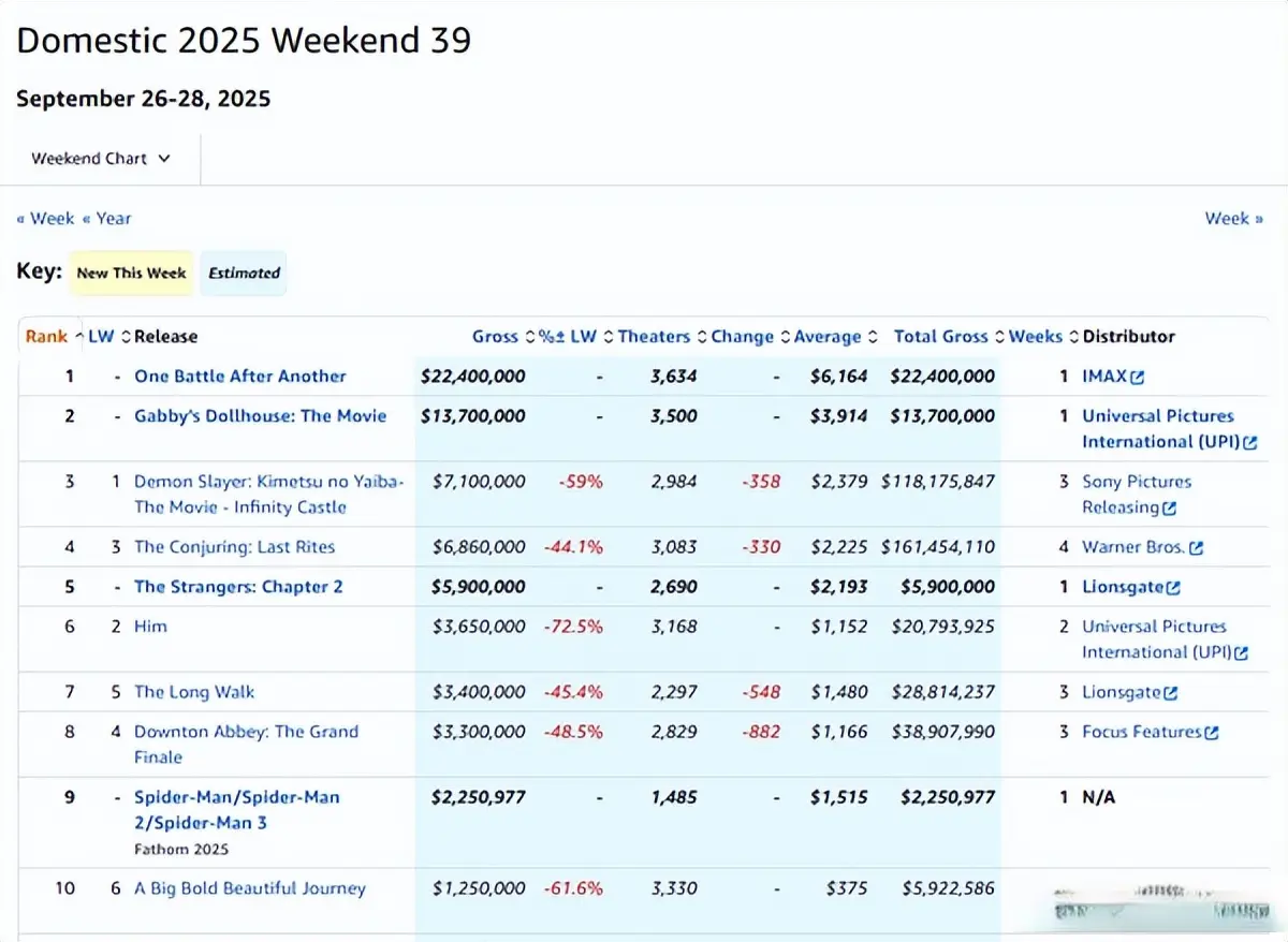 北美最新周末(9.26-9.28)票房出炉!“小李子”莱昂纳多·迪卡普里奥主演、PTA保罗·托马斯·安德森导演新片《一战再战》(One Battle After Another)北美首周末三天票房粗报2240万美元(开3634馆)锦盈多,空降北美周末票房榜冠军!创造PTA职业生涯最高开画,也已成为PTA职业生涯总票房第二高的单片,目前仅次于《血色将至》的4020万北美总票房。